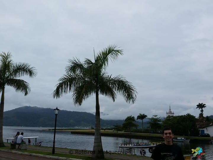 Retorne à Praia do Pontal e, antes de cruzar a ponte para o centro histórico, pare alguns minutos para apreciar a bela vista da baía de Paraty, do centro histórico e dos barcos atracados (alguns fazem os passeios que explicaremos mais adiante!).